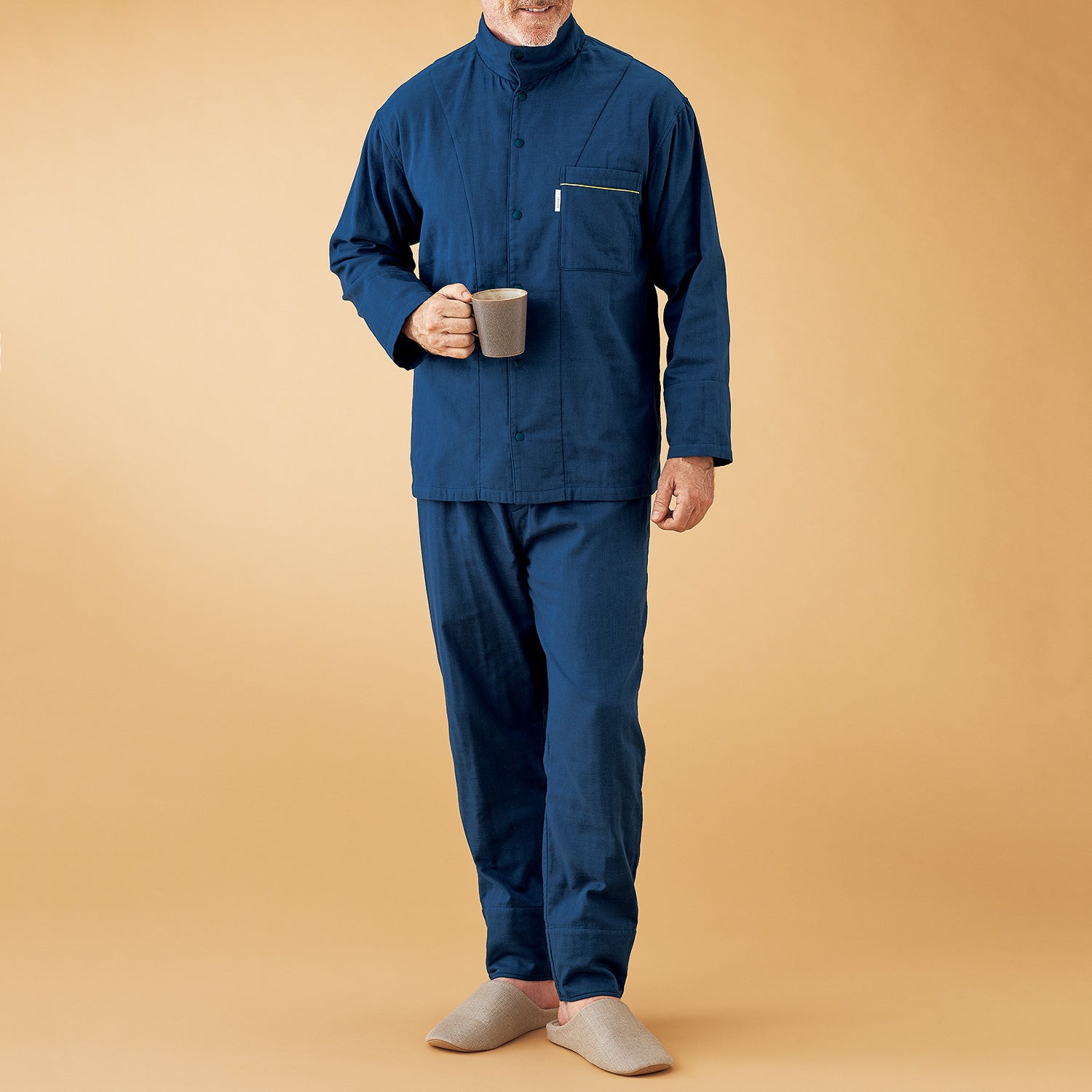 襟元は首を覆うスタンドカラーで暖か。肌触りのよい3重ガーゼ生地とシックなカラーも魅力で、就寝中はもちろん、くつろぎの時間にも活躍してくれます。