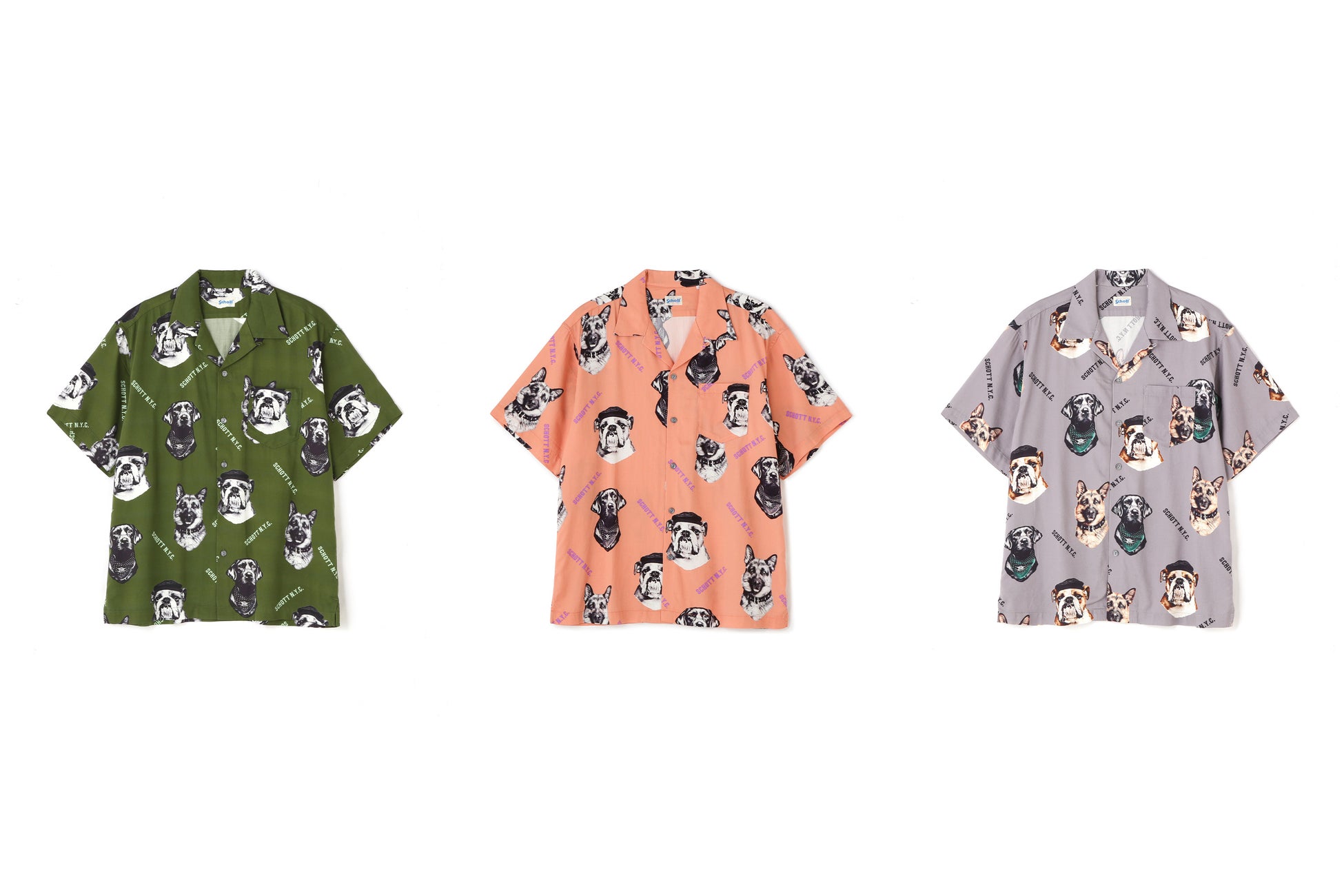 ブルドッグ、ジャーマンシェパード、ラブラドールレトリバーをコラージュしたハワイアンシャツ。