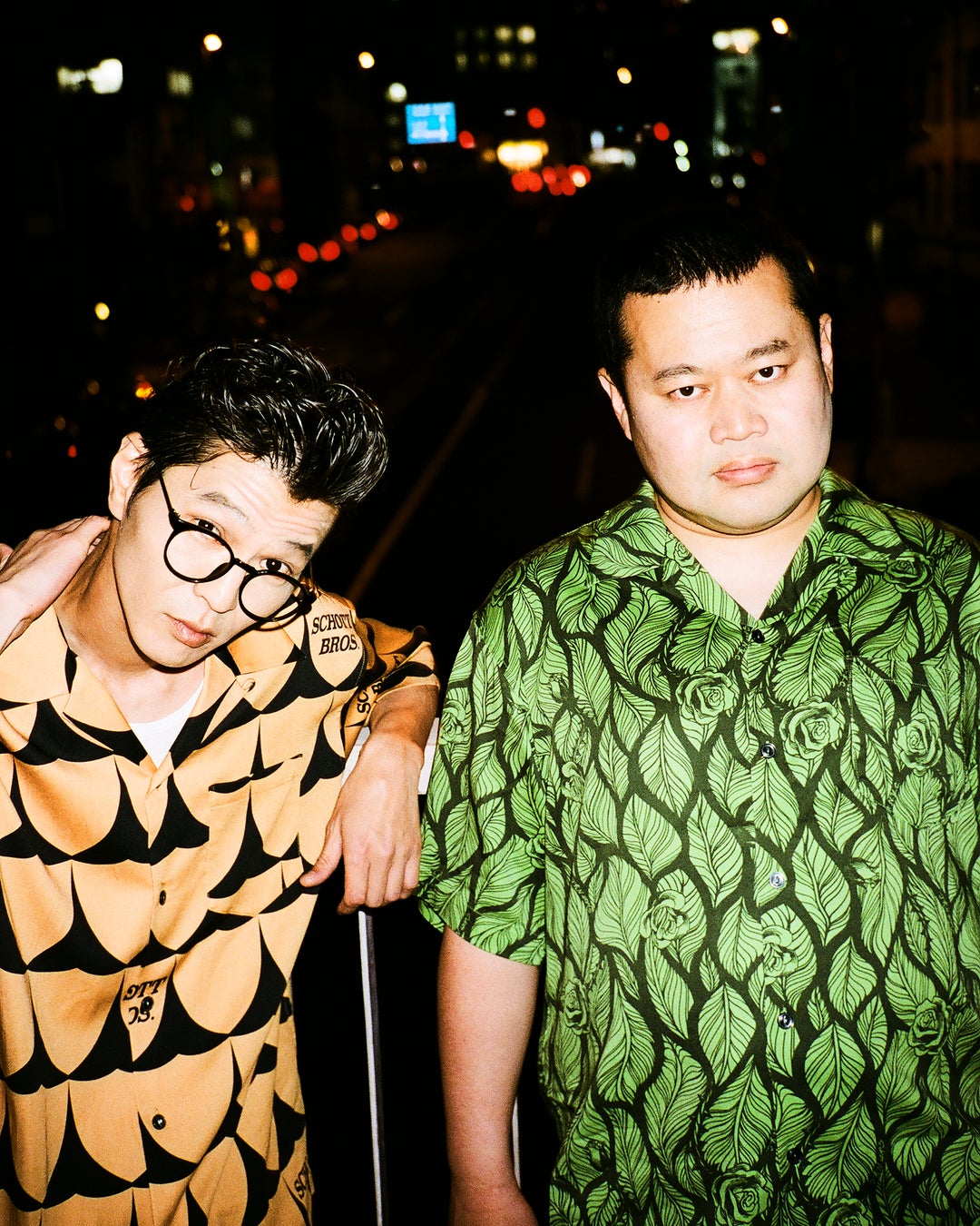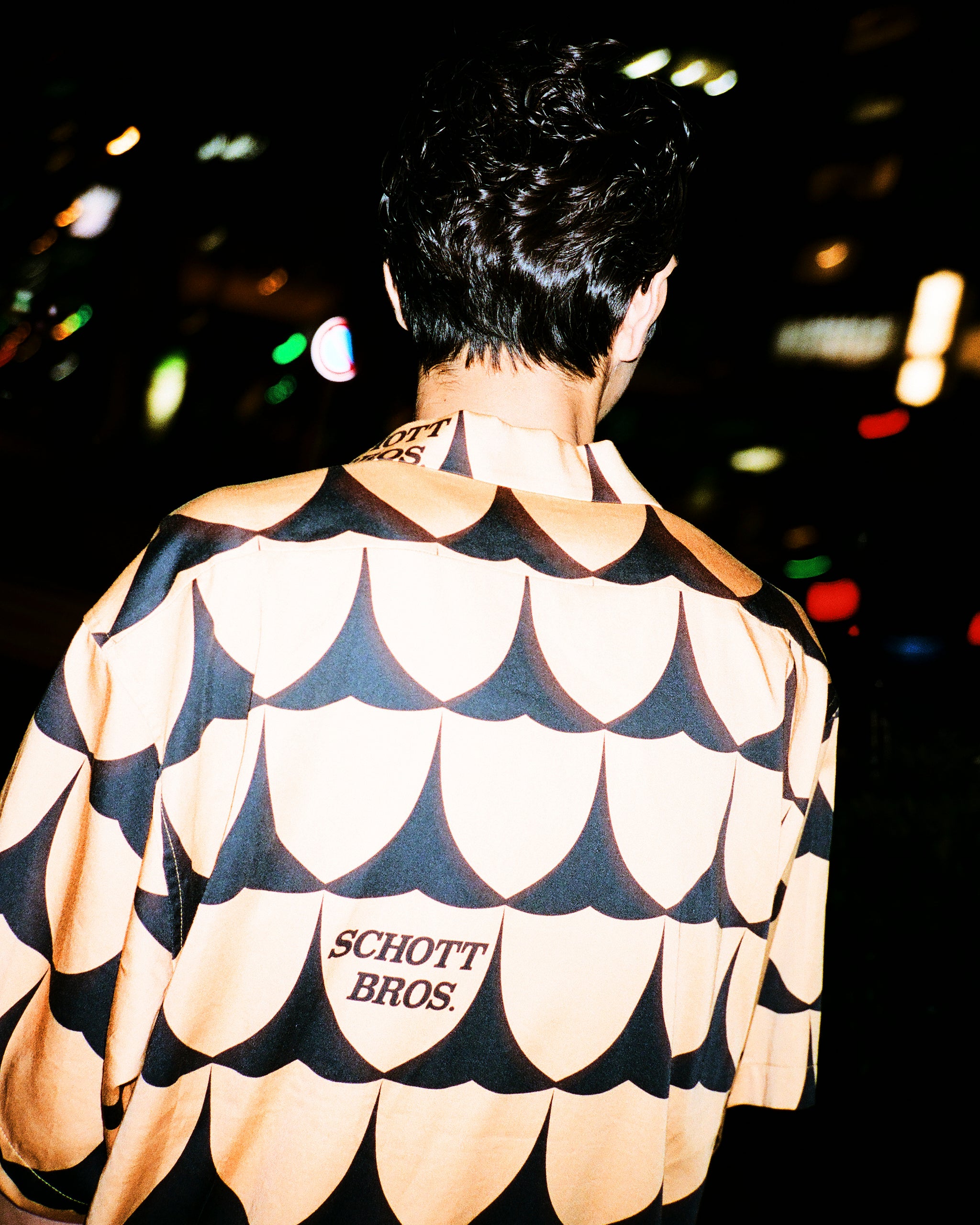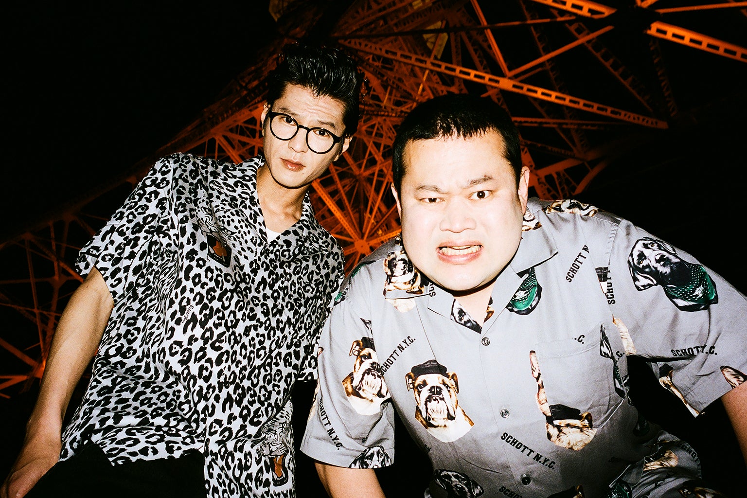 レザーライダースジャケット愛好家であるモグライダーの「芝さん」と、衣装以外の普段着が想像できない相方である「ともしげさん」の2人を、今シーズンの「Schott HAWAIIAN SHIRT COLLECTION」モデルとして撮影。