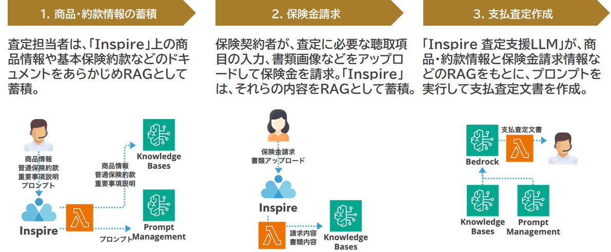 保険契約者からの保険金請求を受けて行われる保険金査定業務は、数百ページにわたることもある複雑な約款に基づいた高度で専門的な判断が求められます。そのため、知見の蓄積や共有が難しく、業務に精通した担当者への負担の偏りや業務の属人化が課題となりがちです。Finatextグループで少額短期保険業を運営するスマートプラスSSIでも、事業拡大に伴う査定数の増加を背景に、査定業務を効率化する必要に迫られていました。そこでFinatextは、査定業務の大半を占める査定文書作成を生成AIで支援する機能をAmazon Web Servicesのサービスを活用して開発し、「Inspire」上で提供することとしました。