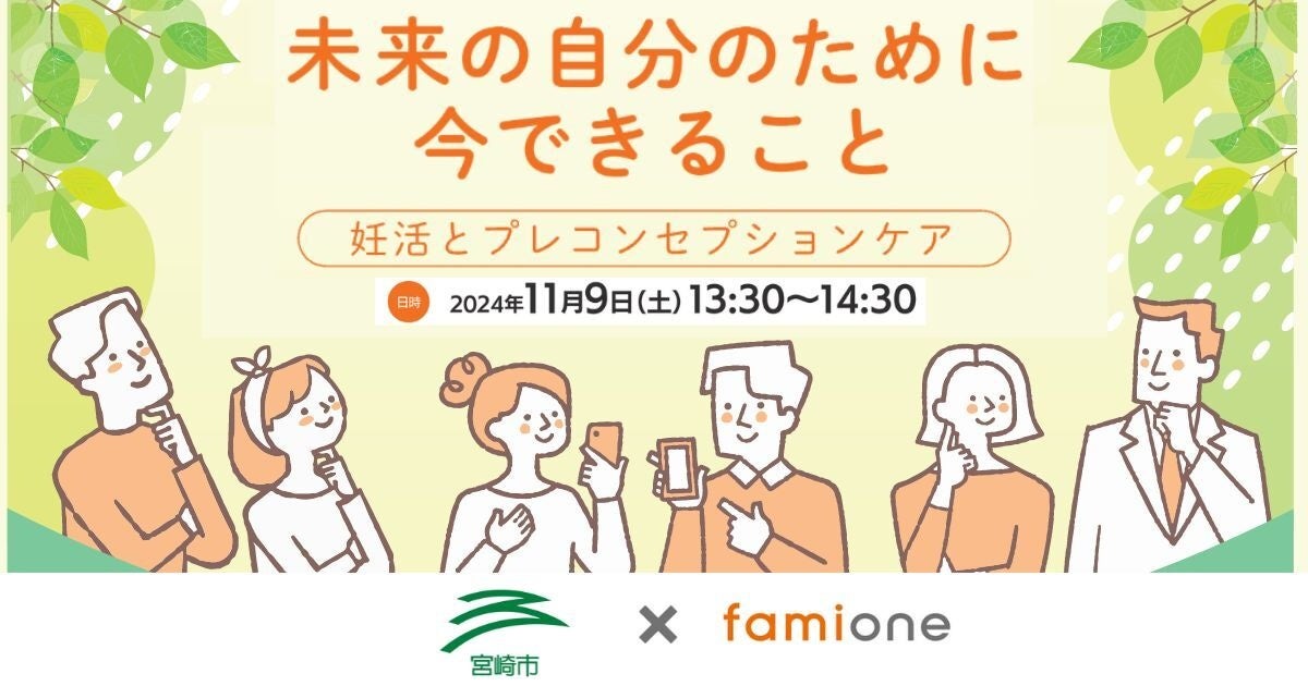 「子どもを願うすべての人によりそい 幸せな人生を歩める社会をつくる」をビジョンに掲げ、法人の従業員向け福利厚生や自治体の住民向け支援を行うヘルスケアサポートサービス「ファミワン」 https://famione.com/benefit/ などを展開する株式会社ファミワン(本社:東京都渋谷区、代表取締役:石川勇介)は、宮崎県宮崎市の妊活サポート事業の一環として、オンラインセミナー「未来の自分のために今できること 妊活とプレコンセプションケア」を2024年11月9日(土)に開催いたします。