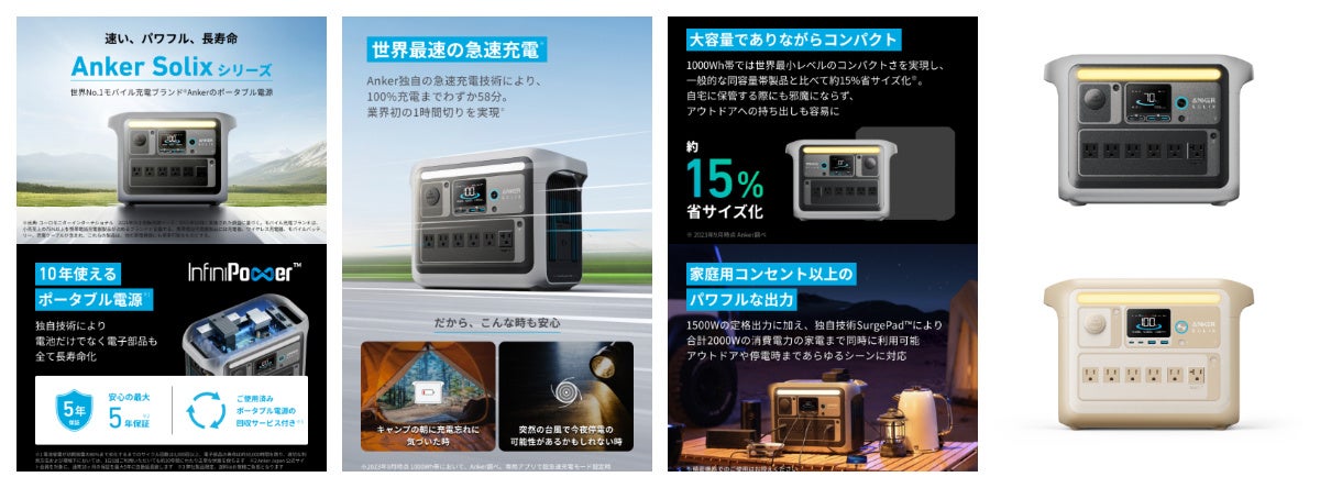 本製品は【世界最速の本体充電(※2)】【パワフルながらコンパクト】【長寿命】と、ポータブル電源に求める要素の全てを備えていることが特徴です。Ankerで培った充電技術を集結し、世界最速のわずか58分で本体を100%満充電できるAnker独自の充電技術を初搭載することで、忙しいキャンプ出発前の朝にも短時間で充電することができます。家族やグループでの使用時も便利な11ポートを搭載し、1056Whの大容量と最大1500Wの超高出力な定格出力を誇ります。電子レンジや電気ケトルをも動かせるパワフルさながら、一般的な同容量帯製品と比べて約15%省サイズ化し、1000Wh容量帯では業界屈指のコンパクトさ(※3)を実現しました。さらに長寿命を実現するため、リン酸鉄リチウムイオン電池の採用や電子部品の発熱抑制、製品本体の堅牢性の向上、バッテリーマネジメントシステムの搭載等によるAnker独自の「InfiniPower™設計」により約10年間安心してお使いいただけます(※4)。なお本製品は、Ankerのポータブル電源で初めて2色のカラーバリエーションをご用意し、ベーシックなグレーに加えてキャンプ用品等の持ち物に合わせやすいベージュも展開予定です。