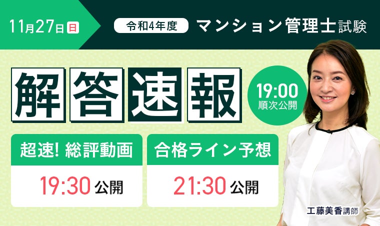 アガルートアカデミーは、2022年(令和4年)マンション管理士試験の「解答速報」「総評動画」「合格ライン・合格点予想動画」を会員登録不要で無料公開いたします。ぜひ、試験の振り返りにお役立てくださいませ。