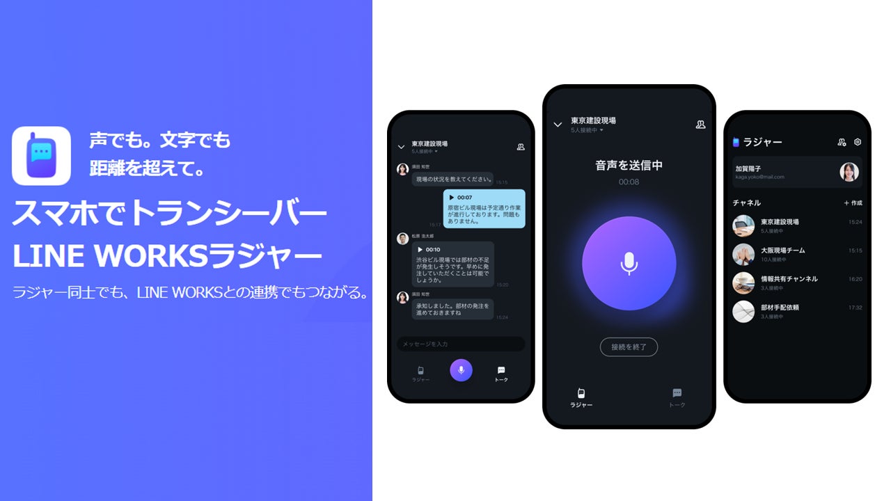 「LINE WORKSラジャー」は、音声AIを活用した、スマートフォン上でトランシーバーのような音声コミュニケーションを実現するアプリです。スマートフォンと専用アプリがあればすぐに使い始めることができ、距離や使用シーンに関係なく、どこでも・いつでもつながります。オフィスなどでは「文字」で、現場では「声」で、といった状況に応じたコミュニケーション方法を柔軟に選択いただけます。