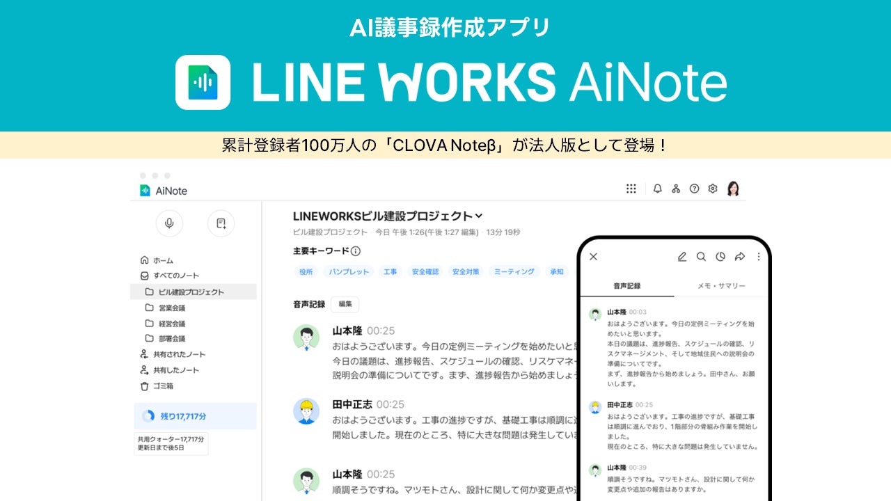 ビジネス現場のコミュニケーションツール「LINE WORKS」や各種AI製品を提供するLINE WORKS株式会社(本社:東京都渋谷区、代表取締役社長:島岡 岳史)は、「LINE WORKS AiNote」と「LINE WORKSラジャー」が国土交通省の新技術情報提供データベースシステム「NETIS(New Technology Information System)」の「LINE WORKS」に追加されたことをお知らせします。また、建設DXの加速に貢献するために、建設業向けセットプランの提供を5月頃に開始します。