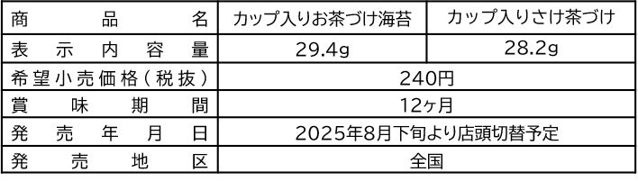 株式会社 永谷園(社長:掛谷 浩志、東京都港区)は、 2024年9月の発売以来幅広いお客様にご支持いただいている「カップ入り お茶づけ海苔」「同さけ茶づけ」をリニューアルいたします(2025年8月下旬より随時店頭切替予定・税抜240円)。