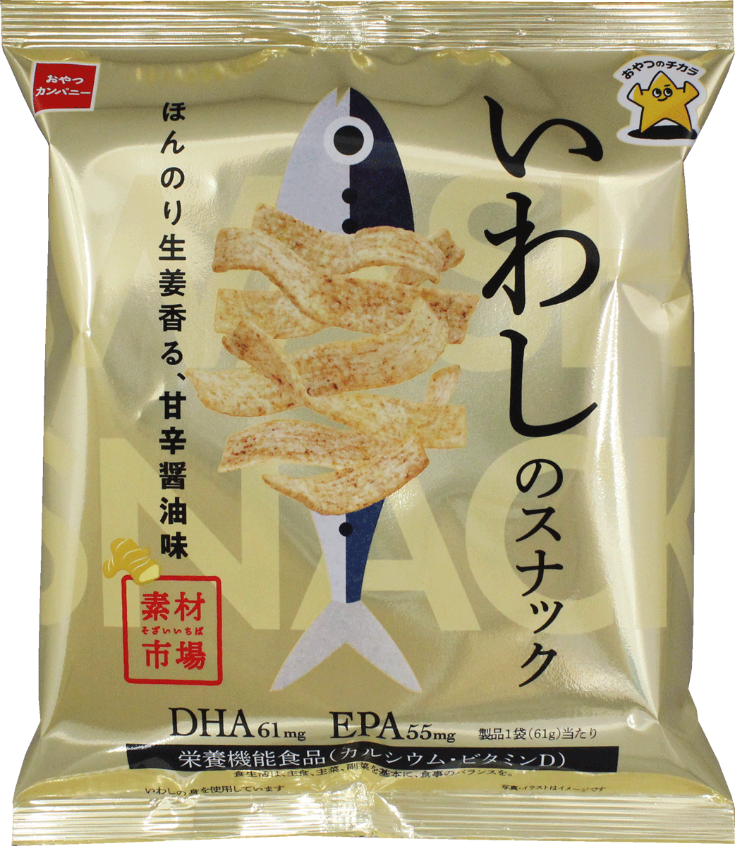 魚を食べたいけれど、料理や後片付けが面倒で少し敬遠されがちな魚を、より多くの方に、より手軽に味わっていただくため、青魚をたっぷり生地に練り込んだ『素材市場 いわしのスナック』『素材市場 さばのスナック』を開発。カリッサクッとしたスナック菓子らしい軽快な食感で、美味しく食べながら、カルシウム、ビタミンD、DHA、EPAの栄養素も摂れるヘルシー感覚のおさかなのスナック菓子『素材市場 いわしのスナック』『素材市場 さばのスナック』を発売しています。