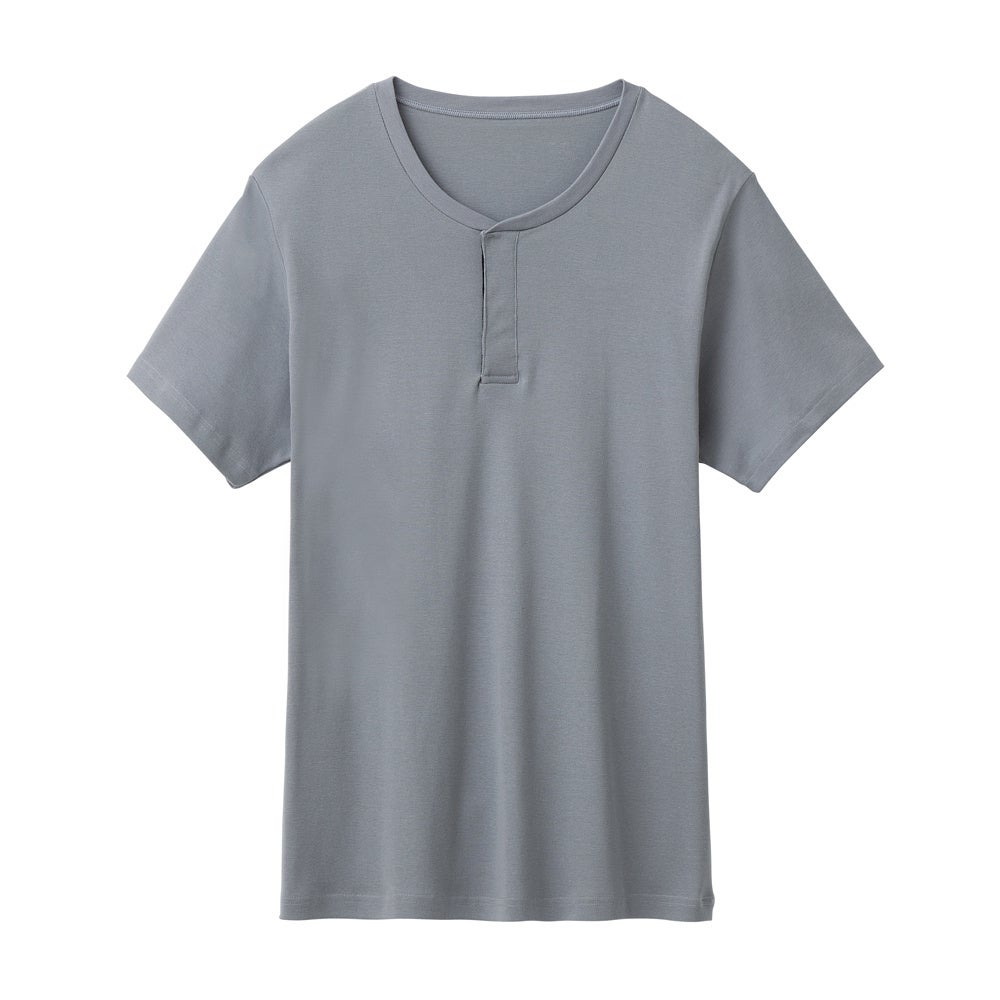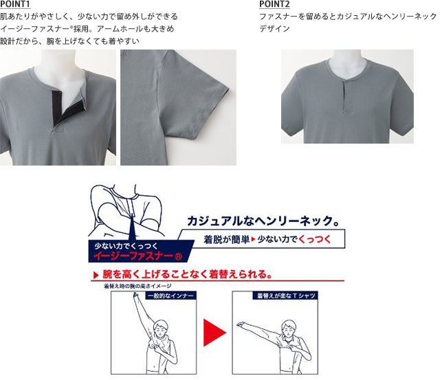 ラクに着替えができて、見た目もカジュアルで着やすい!「着替えが楽なTシャツ」本商品は、腕が上がりづらく、日常の肌着の脱ぎ着を苦痛に感じる方や、入院、通院時の着替えを楽にしたい方のために開発しました。脱ぎ着をする際に、首元が大きく開くように首中央を開閉できるデザインにし、肌あたりがやさしく簡単に留め外しができる吸着資材「イージーファスナー®」を採用しました。さらに、アームホールをゆったりした設計にすることで、腕が上がりづらくても脱ぎ着をしやすくしています。半袖と長袖、グレーとブラック2色展開。着用後に首元を閉じればヘンリーネックデザインのシャツとしても着ることができます。ラクに着替えができて、見た目もカジュアルで着やすい「着替えが楽なTシャツ」が、毎日の肌着の脱ぎ着をサポートします。