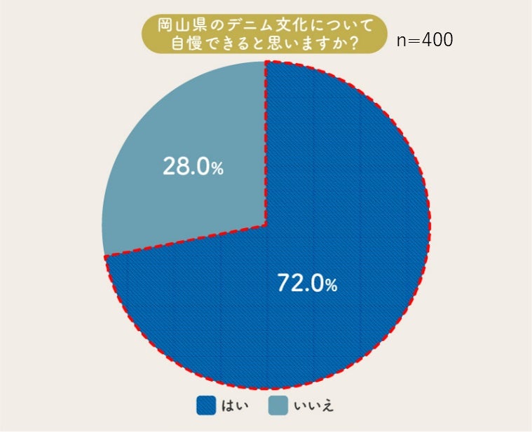 「あなたは岡山県のデニム文化について自慢できると思いますか?」という質問に対しては72.0%が「はい」と回答。岡山県民にはデニム文化が浸透しているとともに理解が深く、デニム文化を誇りに思っていることがうかがえます。