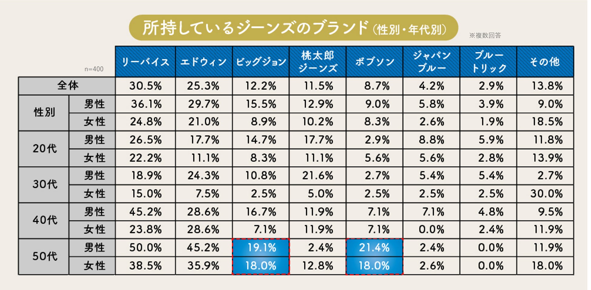 性別・年代別にみると、年代が上がるにつれて所有率は高い傾向にあります。50代では「ビッグジョン」の所有率が男性19.1%、女性18.0%とほかの年代に比べて群を抜いて高く、「ボブソン」に関しても男性21.4%、女性18.0%と男女問わず所有率が高いことがわかりました。