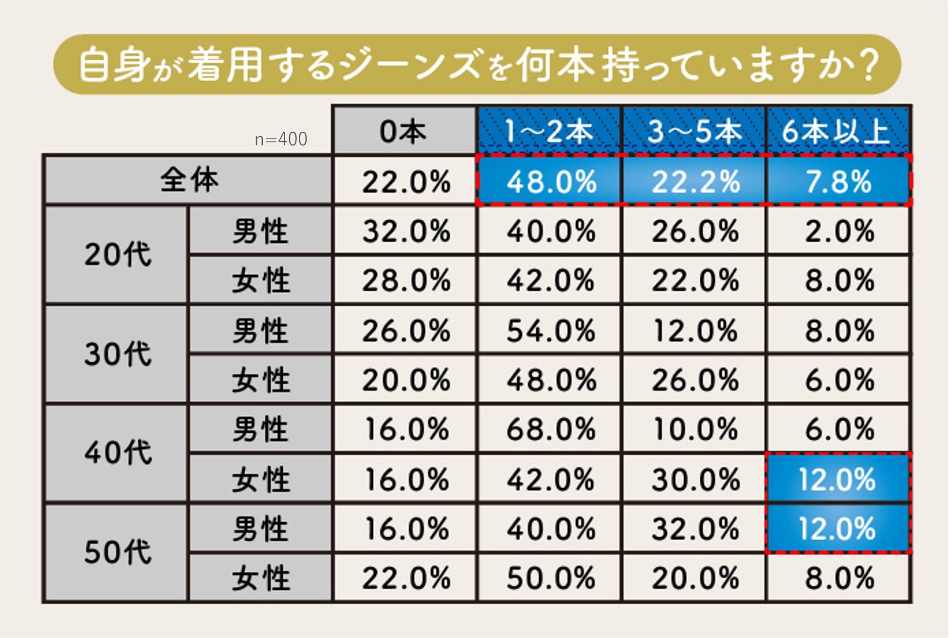 ジーンズの所有本数については、78.0%と約8割の人がジーンズを1本以上保有している結果となりました。本数は「1〜2本」が48.0%と最も多く、性別、年代で最も高い結果となりました。