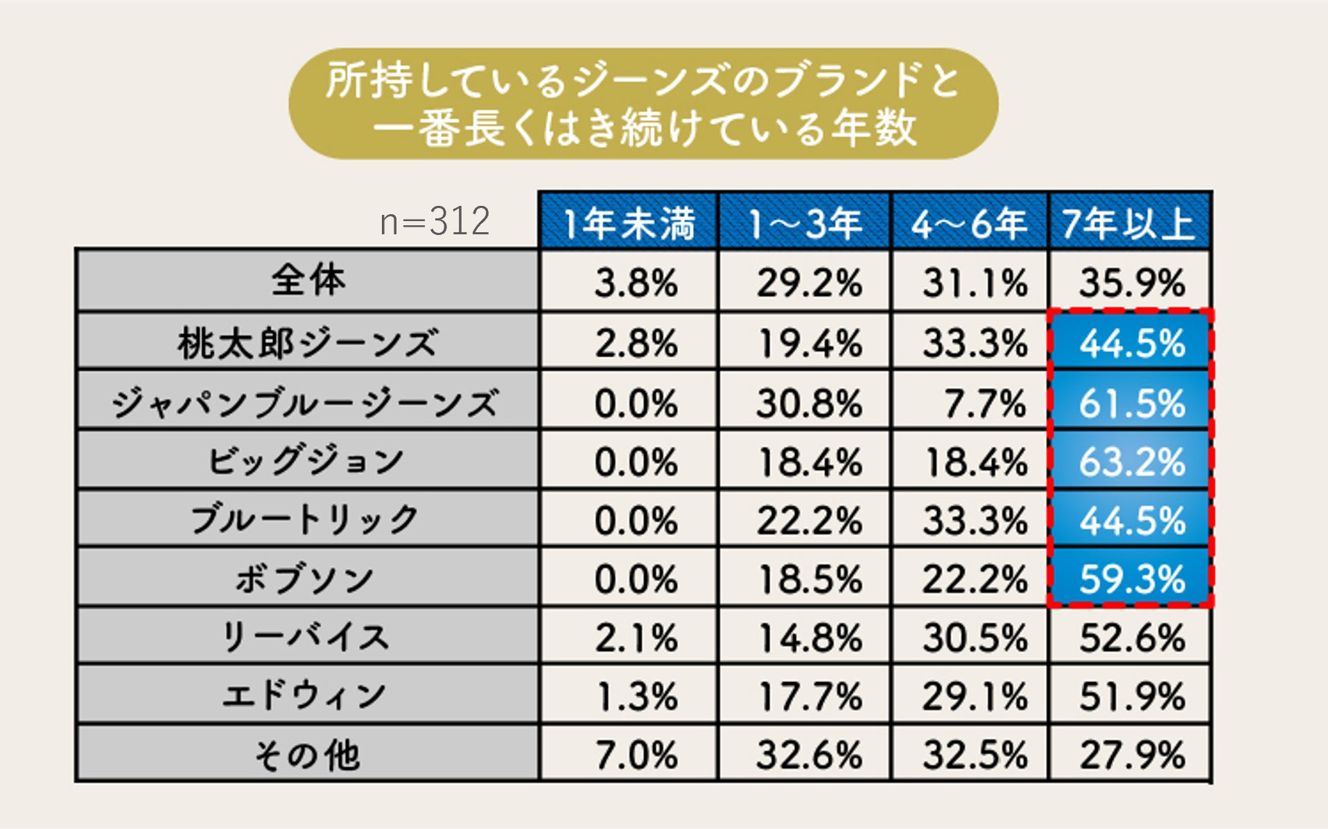 また、所有しているジーンズのブランドを軸にみると、岡山生まれのジーンズブランドを所有している方は、実に半数程度が「7年以上」はき続けていることが明らかに。なかでも、「ビッグジョン」の所有者が63.2%と最も長くはき続けている割合が高いことがわかりました。