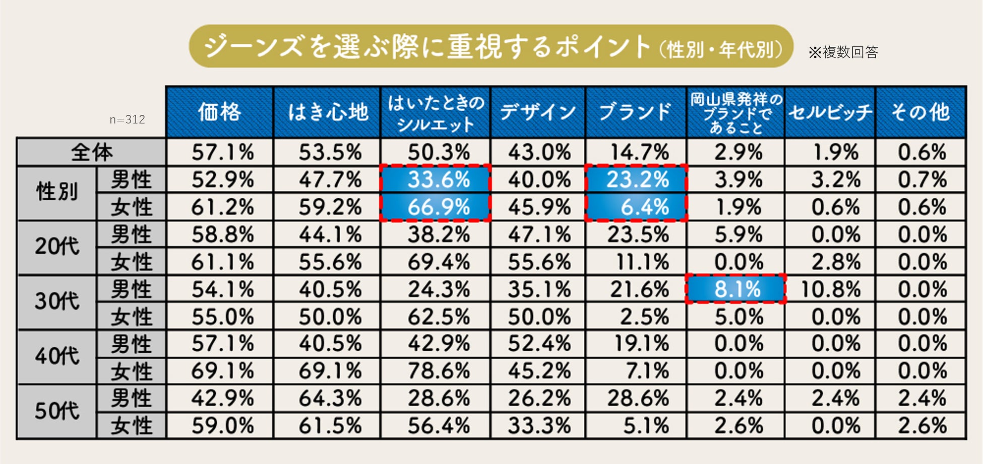 「ジーンズを選ぶ際に重視するポイント」は「価格」の57.1%が最多で、次いで「はき心地」が53.5%となりました。性別年代別でみると「はいたときのシルエット」を選んだ男性が33.6%に対し、女性は66.9%と倍近い差がみられました。一方で「ブランド」を重視する割合は男性が23.2%であるのに対し、女性は6.4%でした。デニムを選ぶ際のポイントとして、女性は見た目(シルエット)を、男性はブランドを重視する傾向があり、男女差が顕著に現れる結果となりました。また、30代男性における「岡山県発祥のブランドであること」の重視度は8.1%となっており、ほかの年代・性別と比べて高い結果となりました。