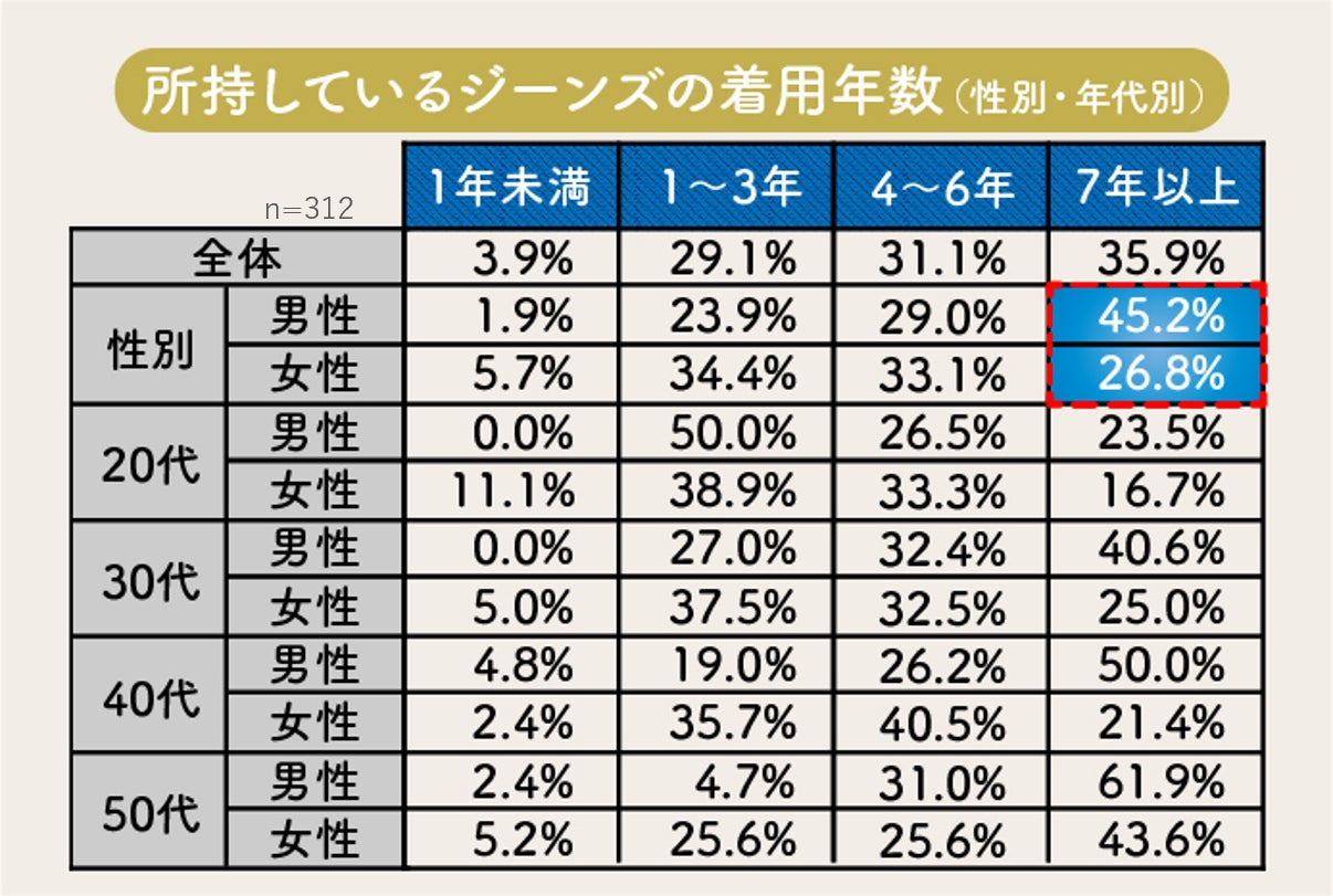 ■ジーンズを7年以上はき続けている人は35.9%、とくに男性は45.2%と半数近い結果。