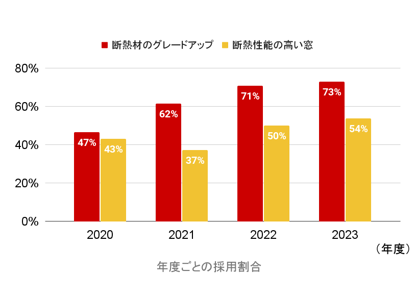 今回、直近4年間(2020年度から2023年度)にオープンハウス・ディベロップメントで請け負った注文住宅を対象に、上記のような断熱性能を向上させる代表的なオプションについて、採用率の推移を調査しました。