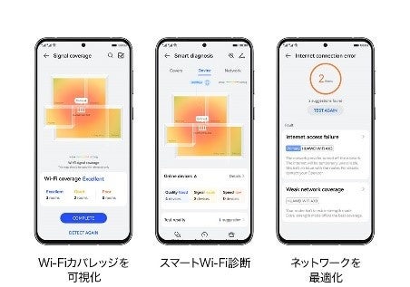 HUAWEI AI Lifeアプリを使えば、接続中デバイスの通信状態の確認、速度制限の設定、ゲストへの接続設定、Wi-Fi接続オフの設定など複雑に思われがちな設定をアプリで簡単に行うことが可能です。また、独自のWi-Fi信号強度表示システムにより、Wi-Fiのカバー範囲を地図で可視化することもできるため、ネットワークの不具合を見つける際に役立ちます。