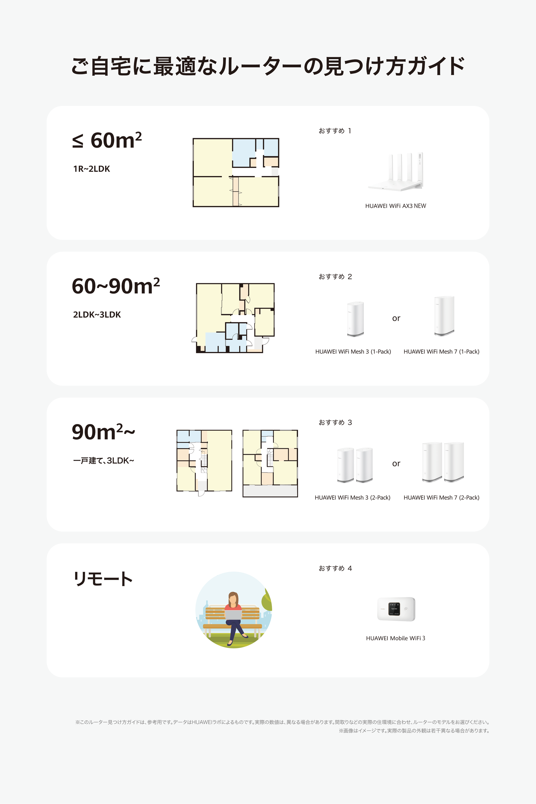 ファーウェイのWi-Fiルーターは、広さや用途に合わせてお選びいただけるフルラインナップで展開中。ご自宅の広さに合わせて最適な製品を見つけてください。また、外出時にもお使いいただけるモバイルWi-Fiルーターもご用意。ご自宅でも外出先でも、ファーウェイのWi-Fiルーターで快適なインターネットをお楽しみください!