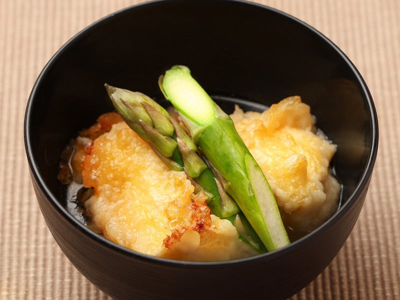 細かく刻んだ那須高原のアスパラガスと那須塩原牛乳で豆腐を作り、揚げ出しに。天ぷらにしたチーズは口の中でとろけます。