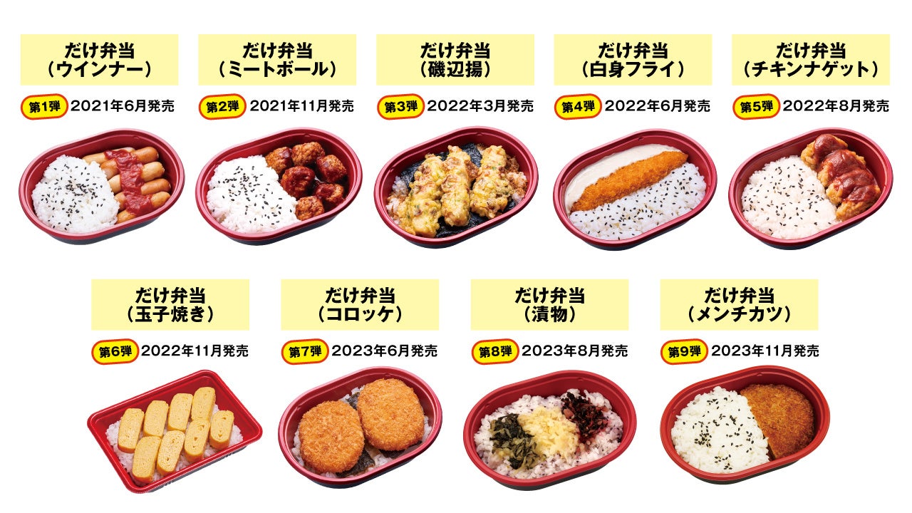 ローソンストア100の大ヒット商品「だけ弁当」は、おかずは1種類だけという超シンプルなお弁当です。「好きなおかず“だけ”をとことん楽しめる弁当があればヒットするはずだ」という一人の社員の信念によって、発案から実に10年越しに商品化された「ウインナー弁当」が始まりです。2021年6月の発売以来、「こういうので良いんだよ!」というお客様からの支持をいただき、「ミートボール弁当」「玉子焼き弁当」「メンチカツ弁当」など、新商品を続々発売。お陰様で2024年1月末時点で、シリーズ累計販売数が500万食を突破いたしました。