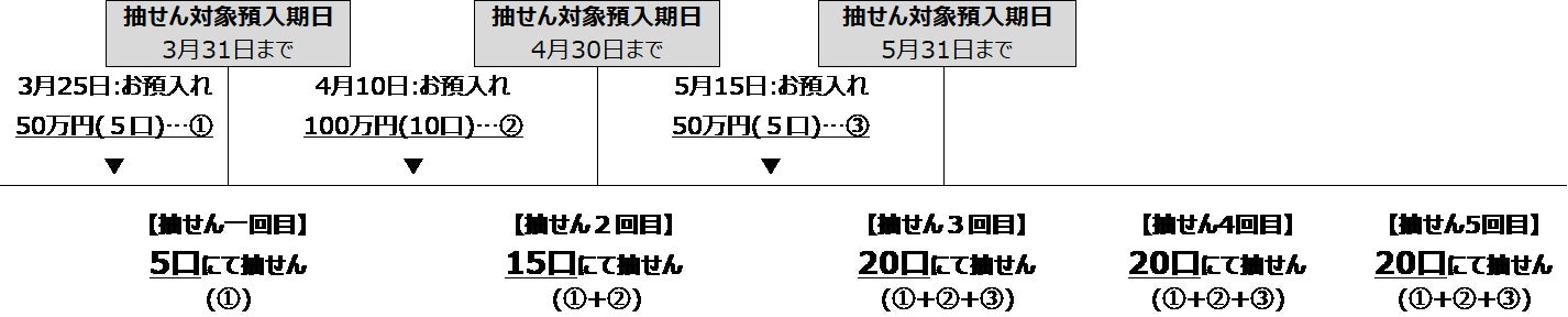 抽せん対象預入期日(3月31日、4月30日、5月31日)までのお預入れ且つ、10万円を1口として抽せんを行います。お預入れ金額および回数に上限はないため、口数が増えるほど当選確率がアップします。