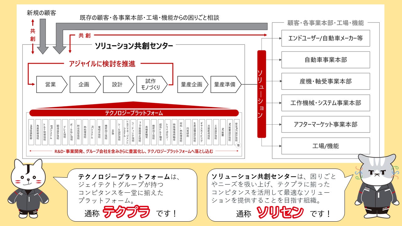ジェイテクトは、JTEKT Group 2030 VISION を掲げ、「モノづくりとモノづくり設備でモビリティ社会の未来を創るソリューションプロバイダー」になることを目指しています。ジェイテクトグループは、製品と製造設備に関する要素技術や知見であるコンピタンスを一堂に集約したテクノロジープラットフォーム(以下「テクプラ」)を活用し、これらのコンピタンスを掛け合わせて社内や社会の困りごとの解決策を提案するソリューション共創センター(以下「ソリセン」)の開設を進めています。