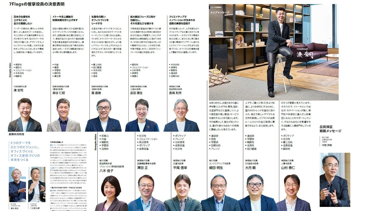 7Flagsの管掌役員の決意表明/事業戦略(事業ポートフォリオ、ワークプレイス事業、設備機器・パブリック事業、海外戦略)