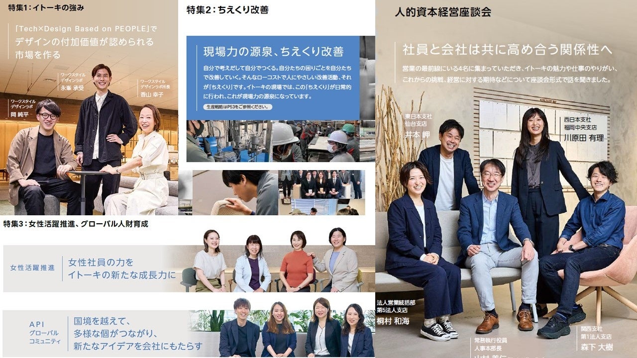 当社は、ミッションステートメント『明日の「働く」を、デザインする。』の実現に向けて、財務・非財務両面において、各種の取り組みを進めています。イトーキの強みを「Tech×Design Based on PEOPLE」と再定義し、より“人”にフォーカスをあて、イトーキの強み、ちえくり改善、女性活躍推進・グローバル人財育成、人的資本経営について特集しました。当社は独自性のある価値創造に挑戦し続けるとともに、社会課題を解決することで、持続的な社会と企業の成長につなげていきます。
