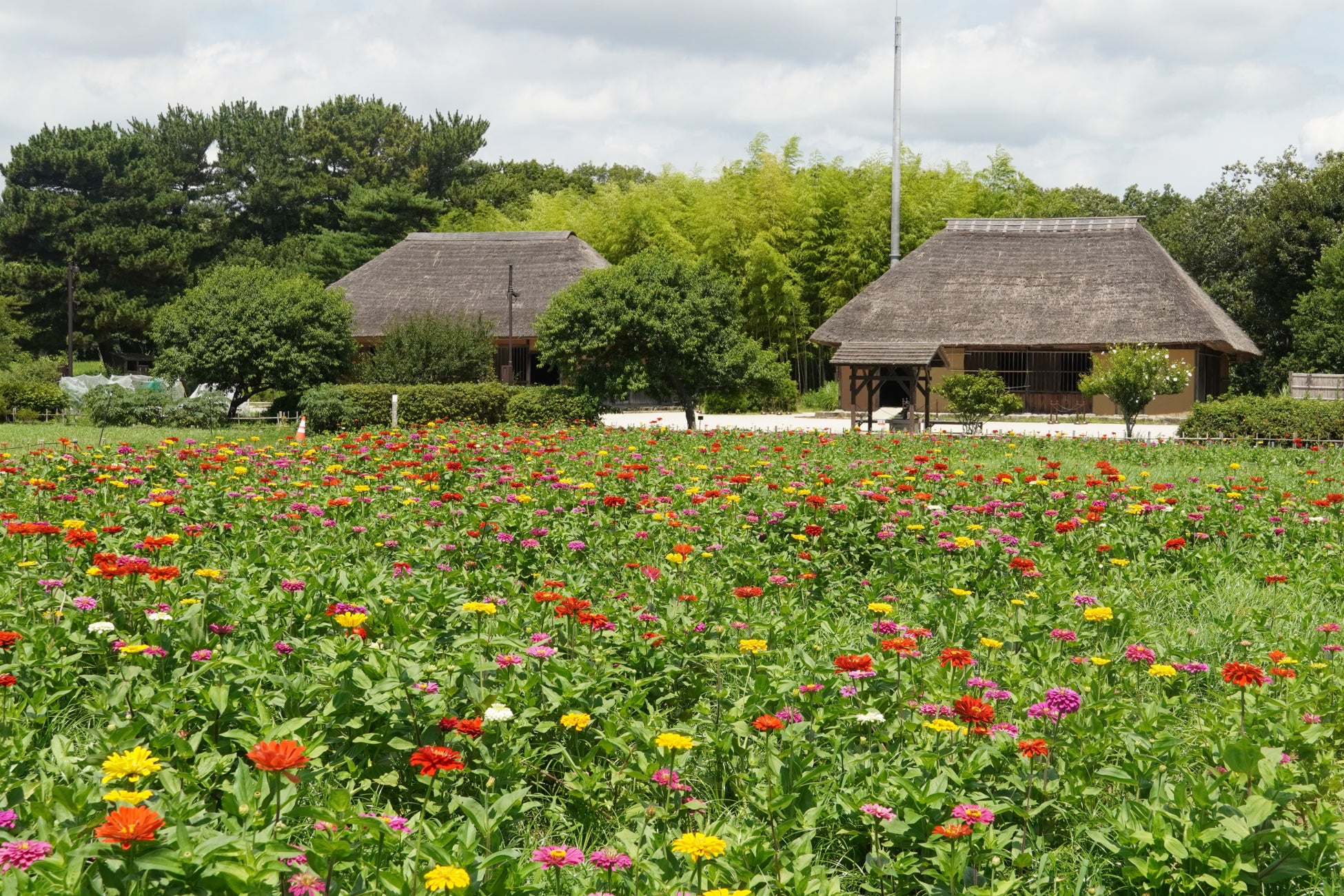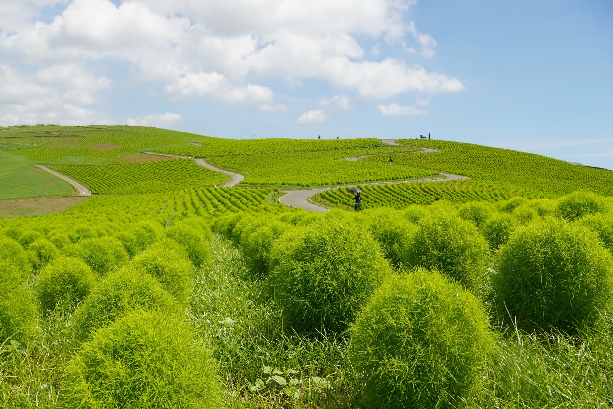 みはらしの丘では、爽やかなライムグリーンのコキアが成長中です。現在約30~40cmのコキアは、真夏の日差しを浴びて8月中旬には“ふわふわ”とした大きく丸い形状で約70cmに成長します。また、丘のふもとの「みはらしの里」では、多彩なカラーバリエーションが魅力の「ジニア」が咲き始めました。古民家の前に広がる様子は、夏のフォトスポットとしても人気です。