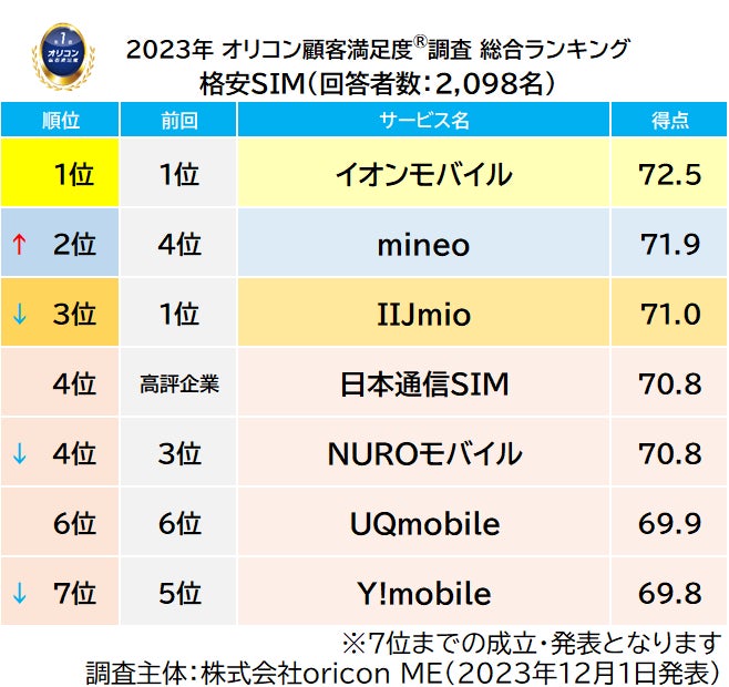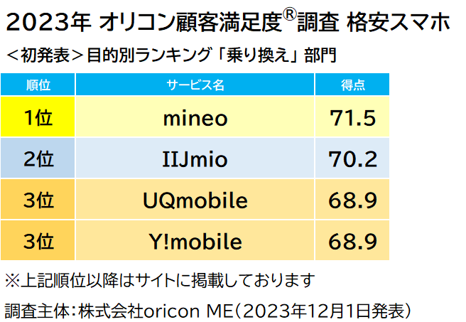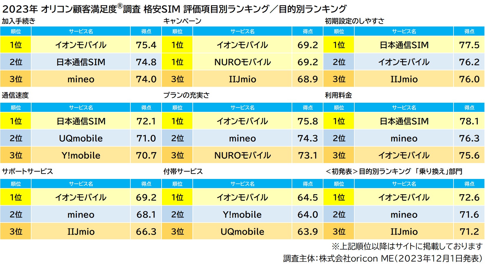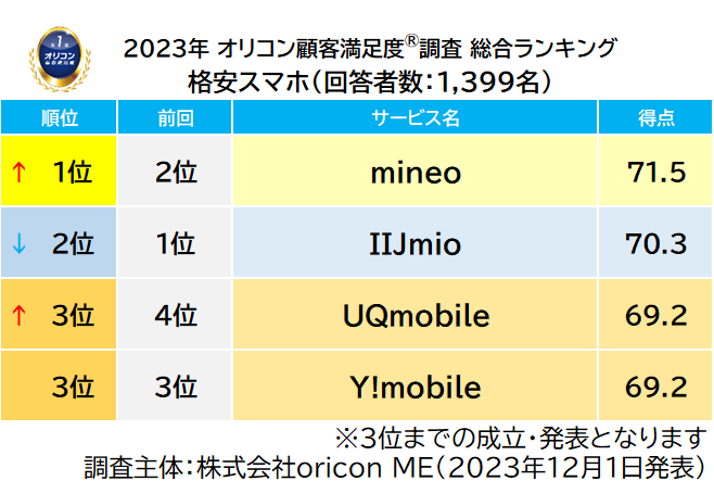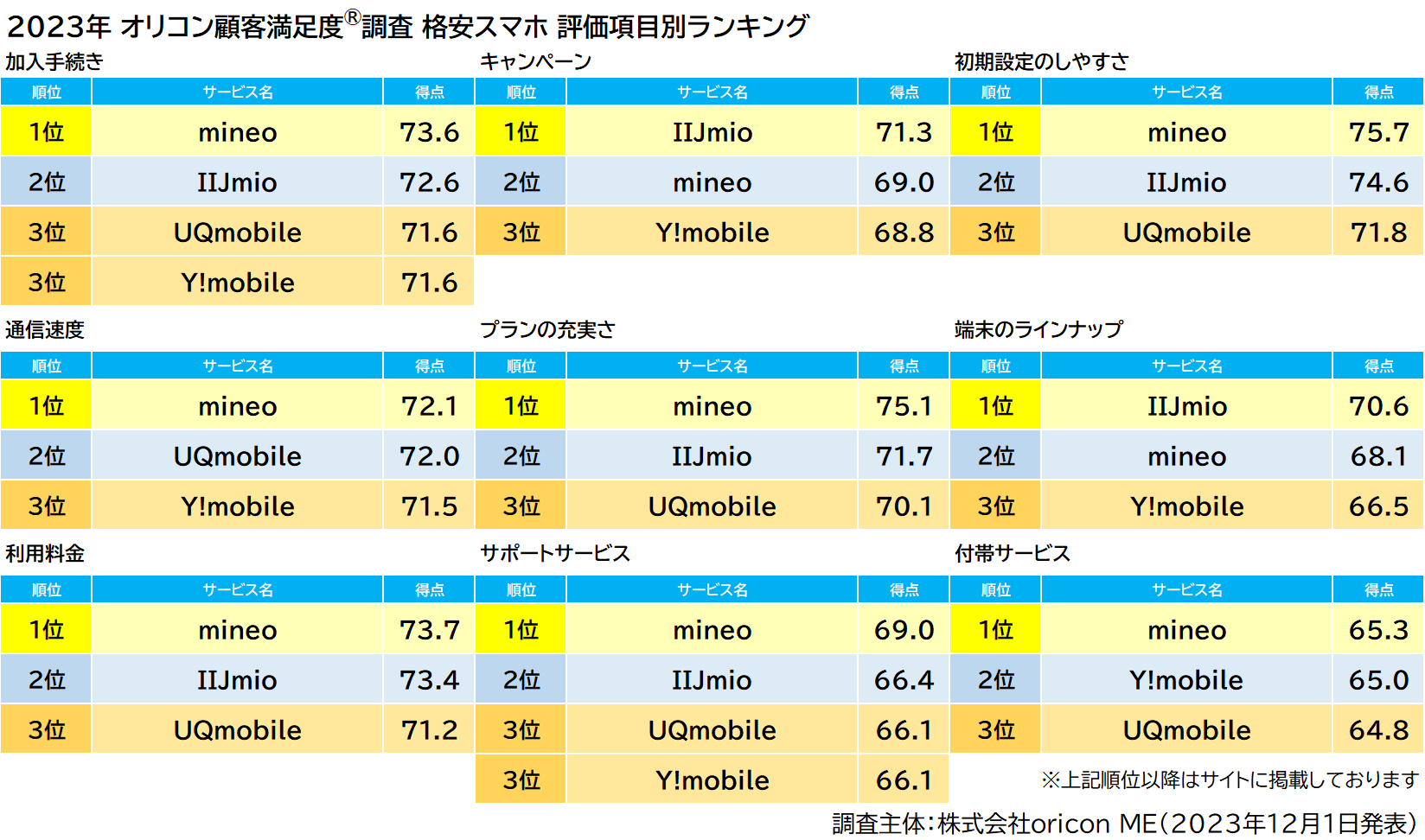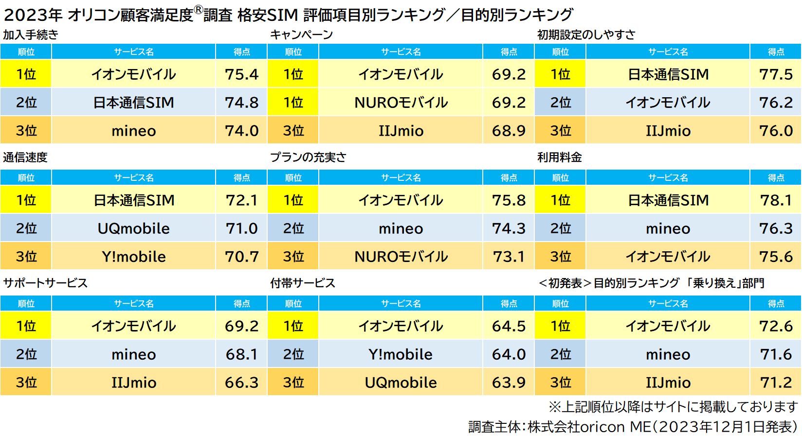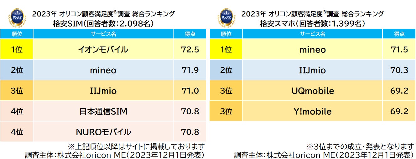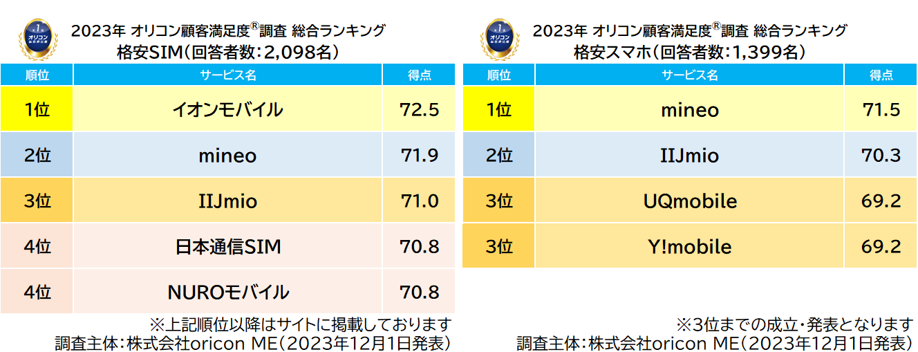 2023年 満足度の高い 格安SIM/格安スマホ(MVNO)ランキング | (オリコン顧客満足度®調査)格安SIMは【イオンモバイル】が2年連続総合1位 格安スマホは【mineo】が2度目の総合1位