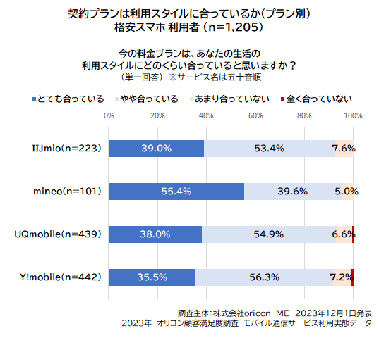 個別プランについて「とても合っている」の割合をみると、2023年の『格安スマホ』ランクイン4社では【mineo】が最も高く55.4%、次いで【IIJmio】が39.0%、【UQmobile】が38.0%、【Y!mobile】が35.5%となりました。