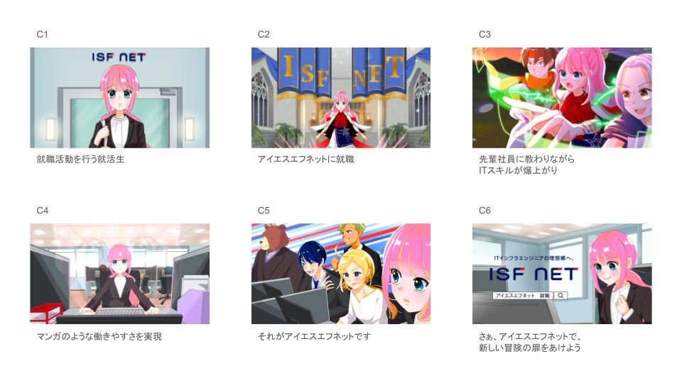 本動画では、アイエスエフネットに就職することで、豊富な教育制度(※1)を活用して、自身の業務や希望するキャリアパスに適したスキルアップが可能になること、さらには、スキルアップしながら、ワークライフバランスも確保できる(※2)ということをアニメ調でコミカルに表現しています。