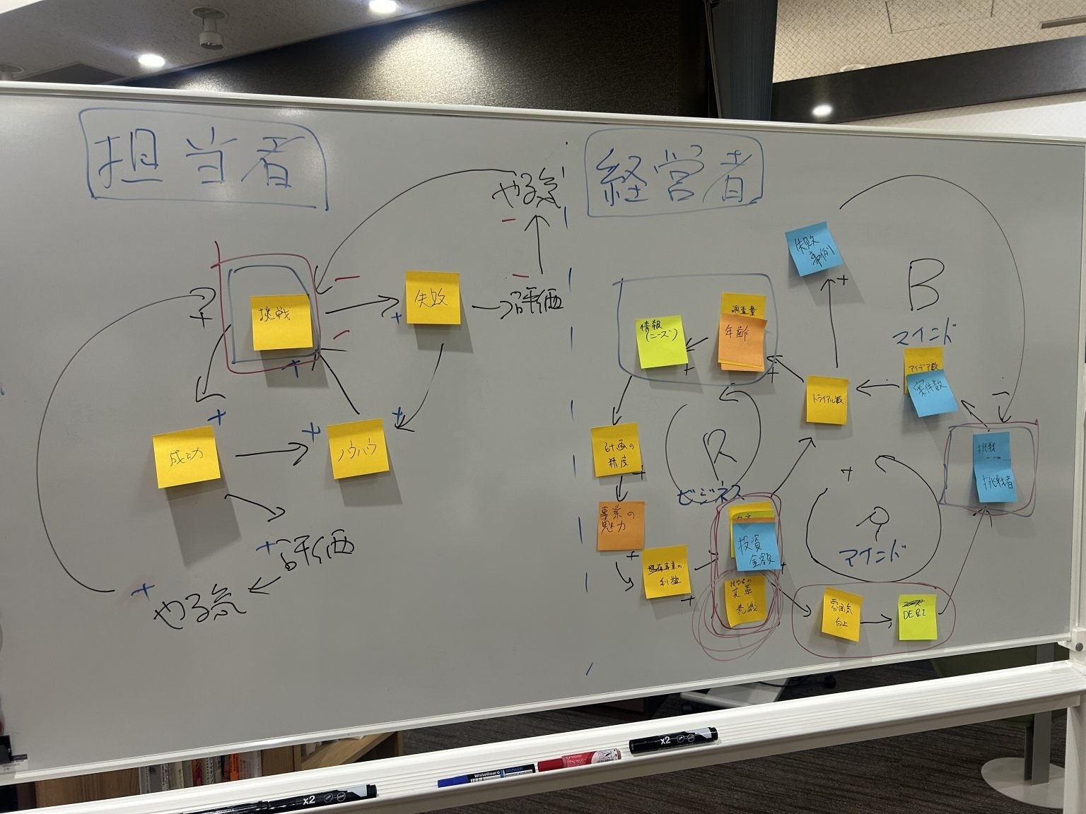 参加者はグループごとにアイデアを持ち寄り、意見を重ねながら因果ループ図を作成しました。