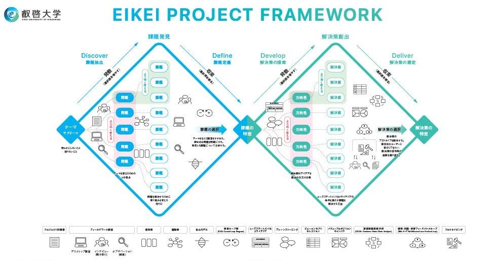 叡啓大学では、学生たちが実社会の問題に取り組む際に活用できる独自のフレームワーク「叡啓プロジェクトフレームワーク」を整備し、課題解決演習(PBL)において学んでいます。