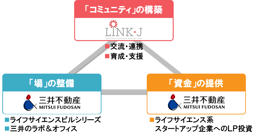 三井不動産は、新産業創造を重要な戦略と位置づけています。ライフサイエンス領域では、スタートアップ企業や大学、病院、大手製薬会社などのキープレイヤーが、コラボレーションを通じてお互いの知識・技術・資本を活かしながら、業界の枠を超えて研究開発を発展させていくというエコシステムを、「コミュニティの構築」、「場の整備」、「資金の提供」を通じて構築することで、ライフサイエンス領域におけるイノベーション創出を支援します。