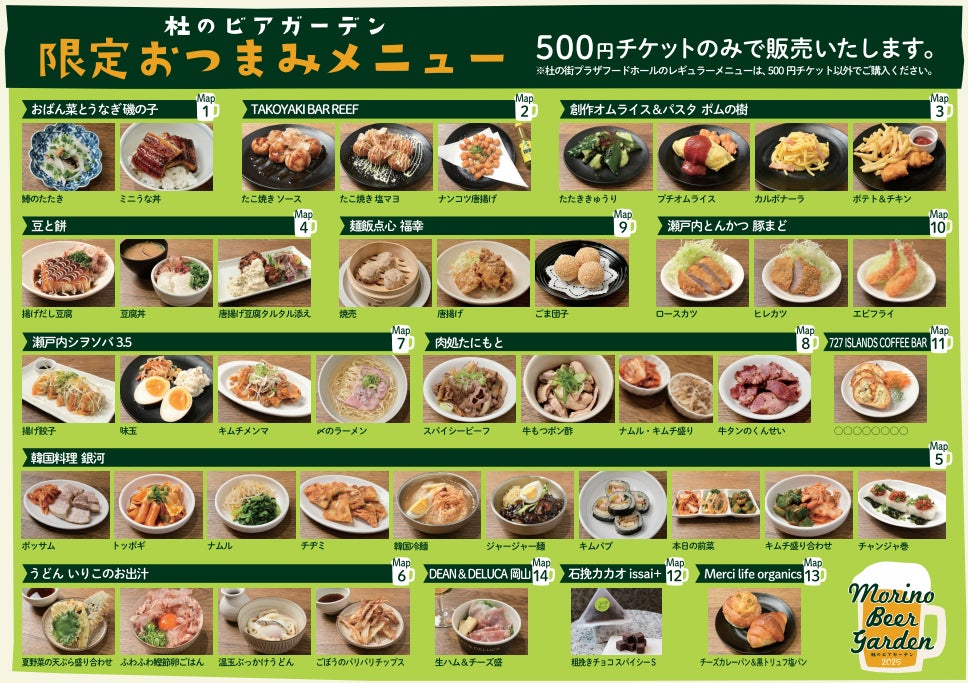 杜の街グレースの東側広場に設けられた開放的な空間で、岡山・全国のクラフトビールや日本酒飲み比べセットなど多彩なドリンクを味わいながら、各店こだわりの限定おつまみ(全44種)を楽しめる“杜の街グレースならでは”のビアガーデンです。
