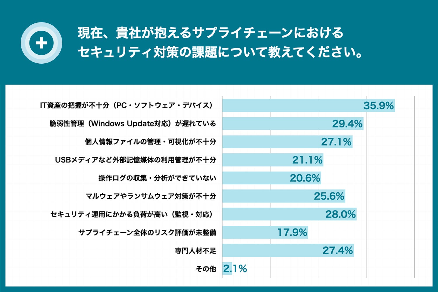 「現在、貴社が抱えるサプライチェーンにおけるセキュリティ対策の課題について教えてください」(n=700)と質問したところ、最も多かったのは「IT資産の把握が不十分(PC・ソフトウェア・デバイス)」で35.9%、次いで「脆弱性管理(Windows Update対応)が遅れている」が29.4%、「セキュリティ運用にかかる負荷が高い」が28%、「専門人材不足」が27.4%という結果でした。
