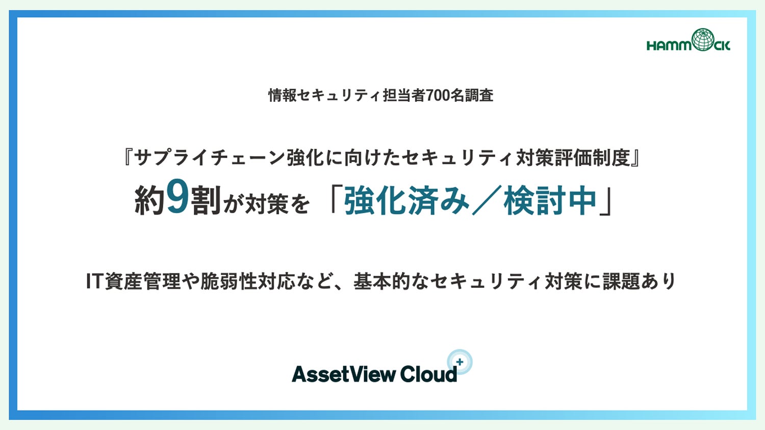 株式会社ハンモック(本社:東京都新宿区、代表取締役社長:若山 大典、証券コード:173A、以下「ハンモック」)は、情報セキュリティ担当者700名を対象に、サプライチェーン強化に向けた情報セキュリティ対策に関する実態調査 を実施しました。