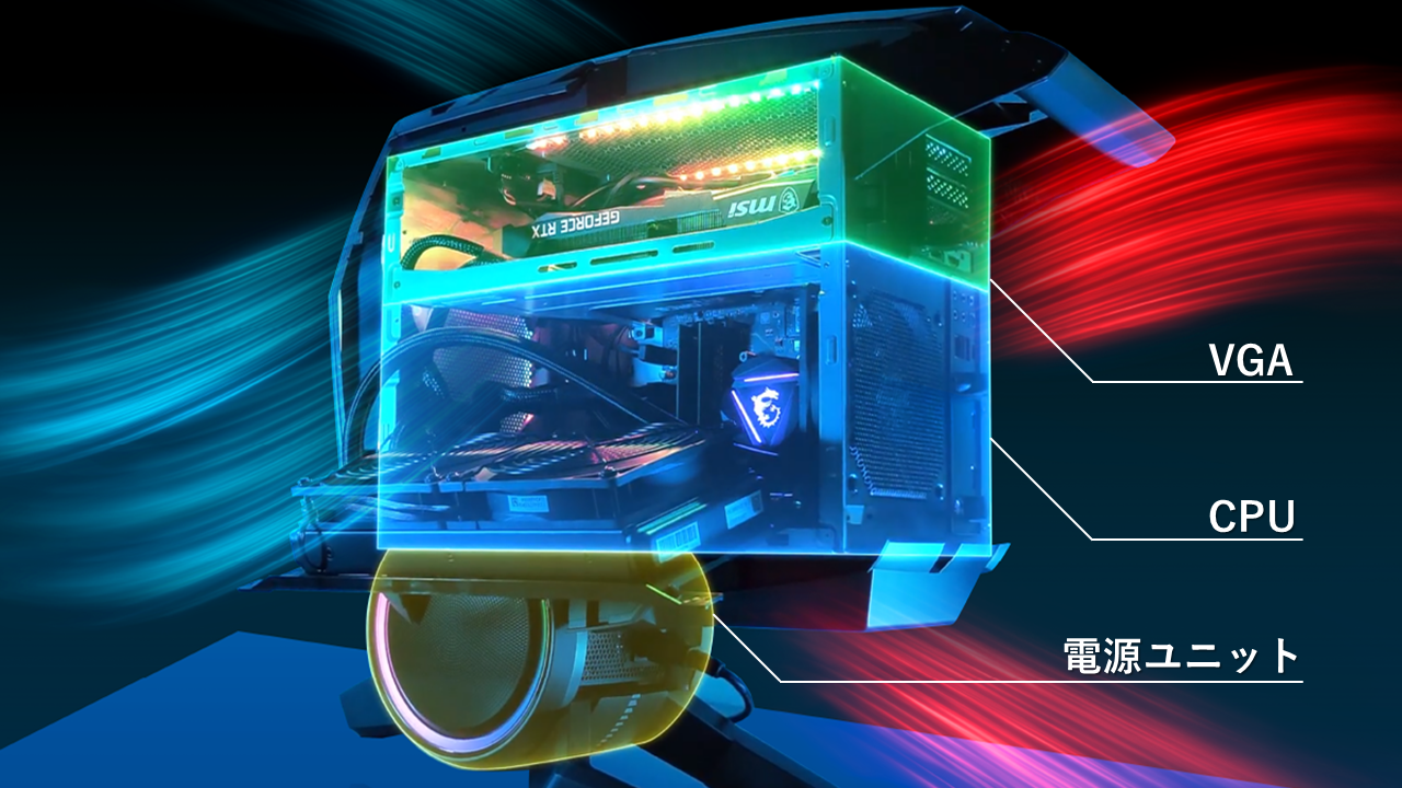 PC内部の熱源となるパーツを独立したブロックに配置することでお互いの熱による干渉を防ぐ