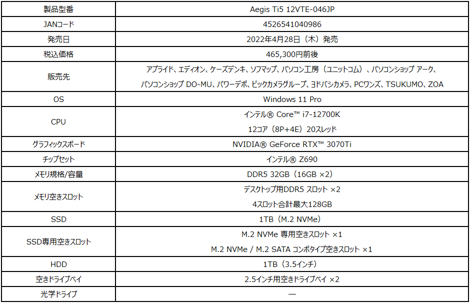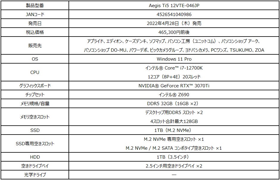 この度、エムエスアイコンピュータージャパン株式会社は2022年4月28日(木)よりゲーミングデスクトップPCブランド「Aegis」の新モデル「Aegis Ti5 12VTE-046JP」を発売いたします。第12世代インテル® Core™ i7 12700K、NVIDIA® GeForce RTX™ 3070Tiを採用し、一度見たら記憶に残る革新的なデザインの筐体とゲーミングノブを採用したハイクラスゲーミングデスクトップPCが新たにラインナップに加わります。