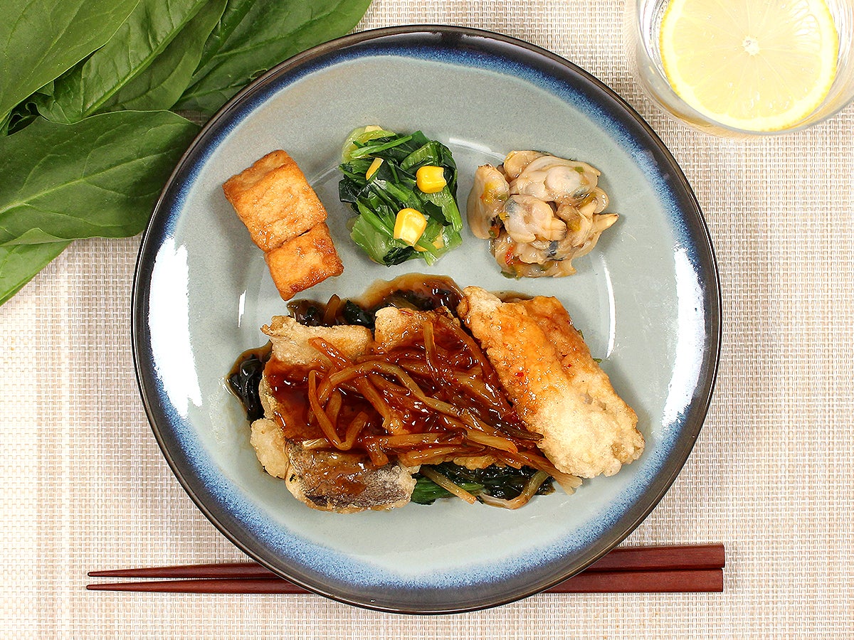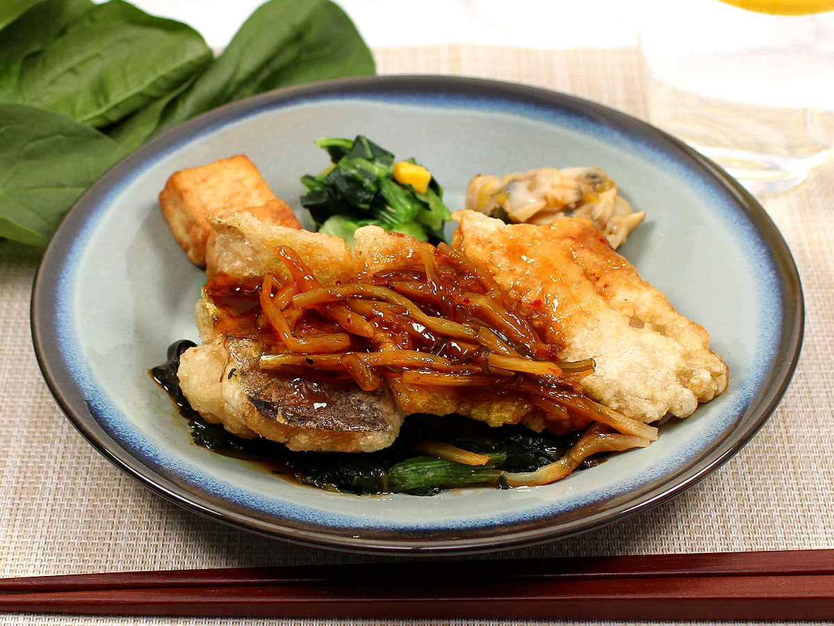 身がふっくらとしたすけそうだらを揚げ、スイートチリソースと中国香醋を使用したピリ辛の甘酢をかけ、中華風に仕立てました。ピリリとした辛さが甘酢の中に広がり、食欲をそそる逸品です。添え野菜には、ほうれん草、タケノコ、茎わかめを使用しており、食感のアクセントにもなっております。