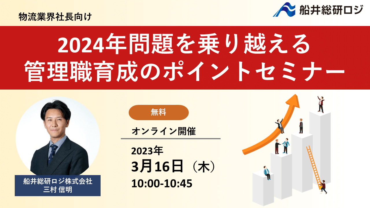 ロジスティクス・物流コンサルティングサービスを提供する船井総研ロジ株式会社(東京本社:東京都千代田区、代表:菅重宏、以下「船井総研ロジ」)は、2023年3月16日(木)10:00~10:45に物流企業の経営者へ向けて「2024年問題を乗り越える管理職育成のポイントセミナー」をオンラインで開催いたしました。