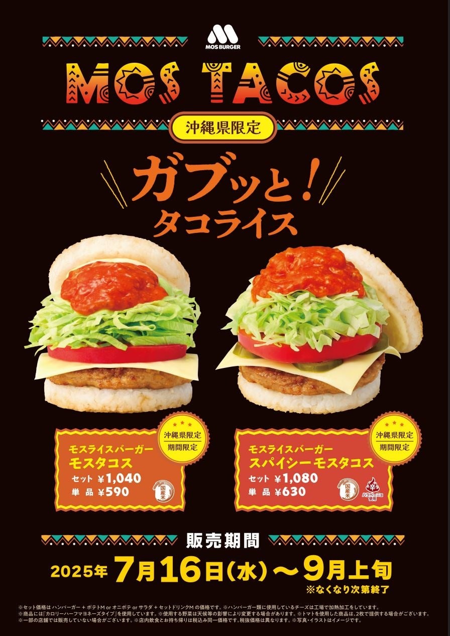 モスバーガーを展開する株式会社モスフードサービス(代表取締役社長:中村 栄輔、本社:東京都品川区)は、2025年7月16日(水)~9月上旬まで、沖縄県のモスバーガー全21店舗及び「モスバーガー大崎店」(東京都)にて、「モスライスバーガー モスタコス」と「モスライスバーガー スパイシーモスタコス」を期間・地域限定で新発売します。