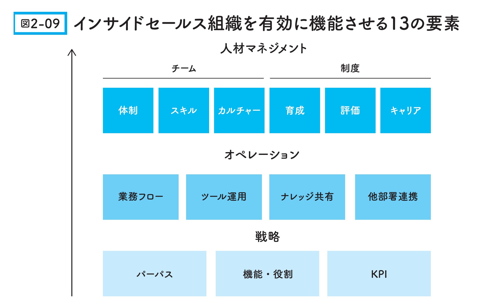 インサイドセールスの組織力を高めるために求められるものは3つのレイヤーが存在します。その上でより細分化した13の要素をわかりやすく解説しています。