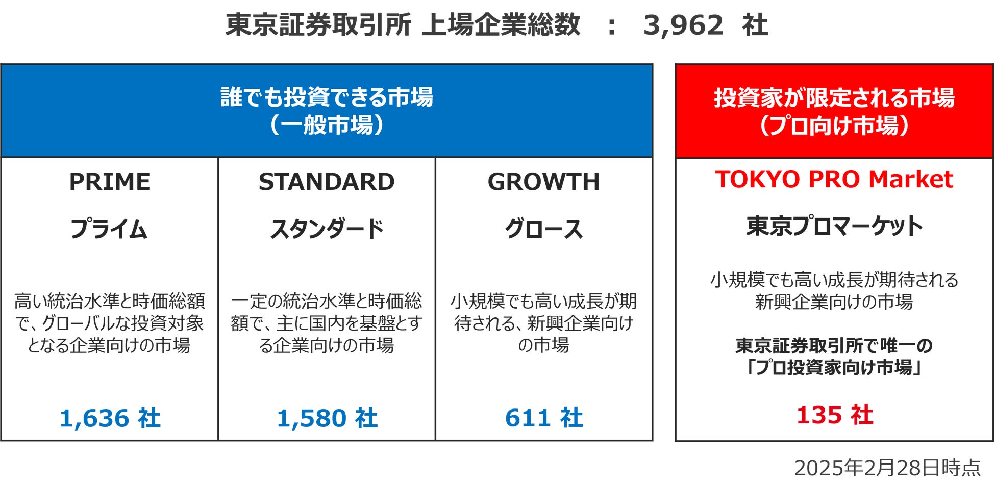 TOKYO PRO Marketは、東京証券取引所が運営する、プロ投資家(特定投資家)のみが参加できる株式市場です。新規上場要件において株主数や時価総額といった数値的な基準が設けられていないため、多くの企業の成長ツールとしての役割を期待されており、主に以下の目的で利用されています。