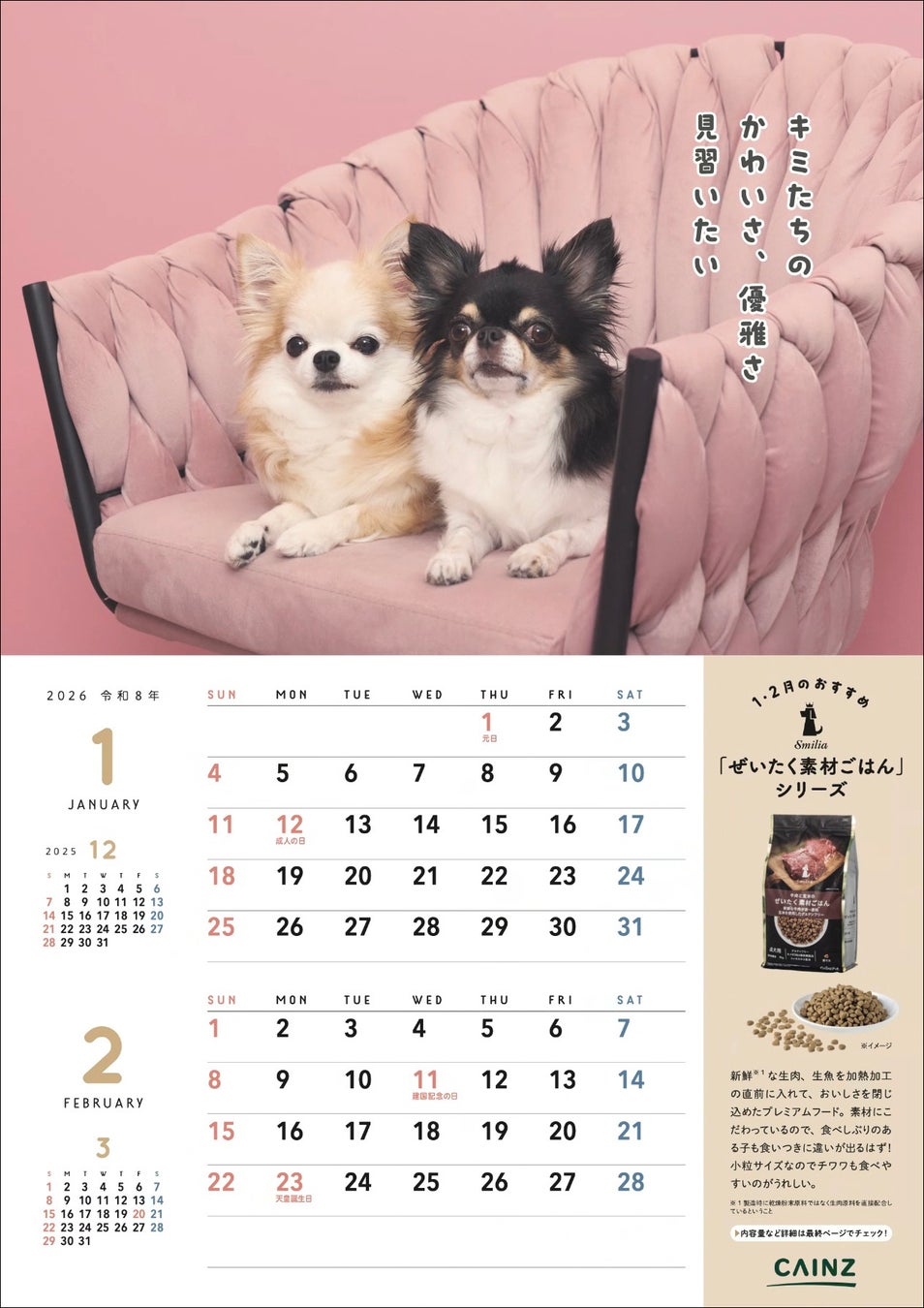 特別付録として、毎月かわいらしいチワワが楽しい川柳を詠んでくれる「チワワ川柳カレンダー 2026」がついてきます。予定も書き込みやすい便利な仕様で、各季節におすすめのフードやオモチャもご紹介♪