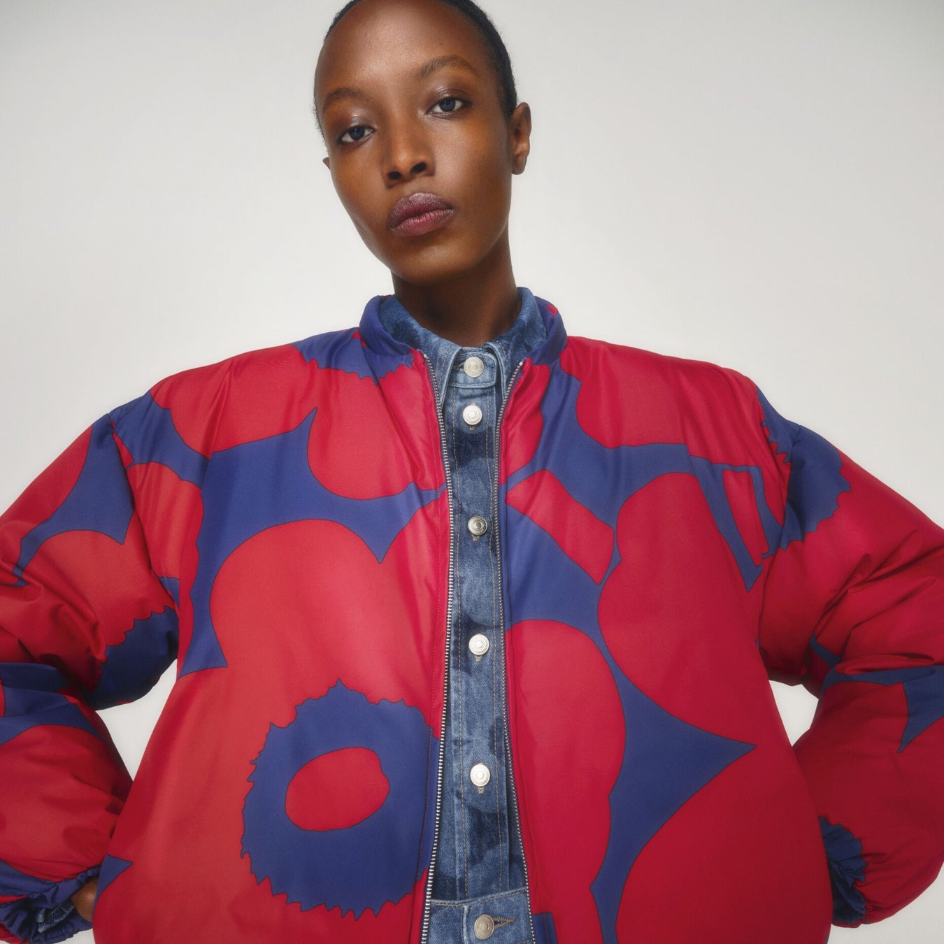 また、スタイルにアクセントを加えるローズレッドのアイテムには、60周年のプリント ウニッコ(Unikko)のアイテムが登場。ウニッコデザインが波打つワンピースや、全面に大胆にプリントされたパデッドジャケットなど、多彩なウニッコのアイテムが、秋のスタイルに広がりをもたせてくれます。