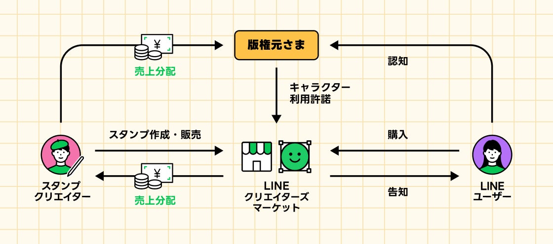 LINE Creators Collaborationは、版権元様から使用許諾を得たキャラクターをLINEクリエイターズスタンプ・絵文字として制作・販売することができる取り組みです。版権元様が所有するキャラクターをモチーフに、クリエイターに制作・販売してもらい認知を獲得しながら売上の一部を収益として受け取ることができます。