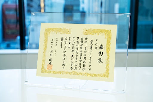 関西将棋会館は建設から40年以上が経過し、建物の老朽化などの課題から、新会館の建設が求められていました。そこで当社は2023年1月に、大阪府高槻市が募集する「ふるさと納税型クラウドファンディング」を通じて1000万円の寄付を実施。市の公益のために寄付をした団体として「篤行賞」を受賞し、2023年11月3日に同市で開かれた「市政施行80周年記念式典」で表彰状と記念品をいただきました。