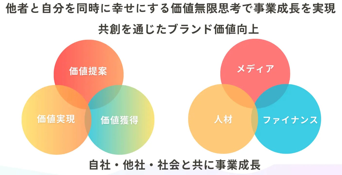 共創:企業と人材、教育機関と採用企業が対等なパートナーシップのもとで新たな価値を創造します。特に「公明正大」「価値無限思考」を基盤とした関係構築を重視します。