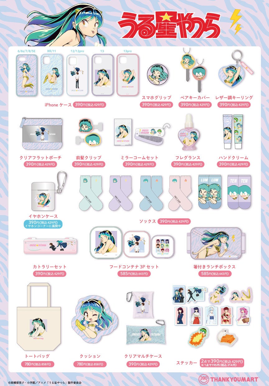 390円(税込429円)を中心としたかわいいアイテムが集まるショップ「サンキューマート」を運営するエルソニック株式会社は、TVアニメ『うる星やつら』とのコラボアイテムを12月中旬より全国のサンキューマート店舗と公式オンラインショップにて入荷順次販売開始いたします。ヒロインの「ラム」ちゃんを中心とした個性的なキャラクターも登場する、レトロかわいいデザインのアイテムです。